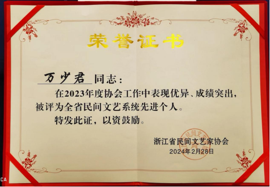 近日,浙江省民间文艺家协会第九届四次理事会暨2024年度工作会议在宁波市宁海县召开,省文联党组成员、书记处书记吕伟刚,中国民协副主席、浙江省民协主席杭间,县委常委、宣传部部长徐旭东参加会议。我校教师万少君被授予2023年度省民协协会工作先进个人的称号。