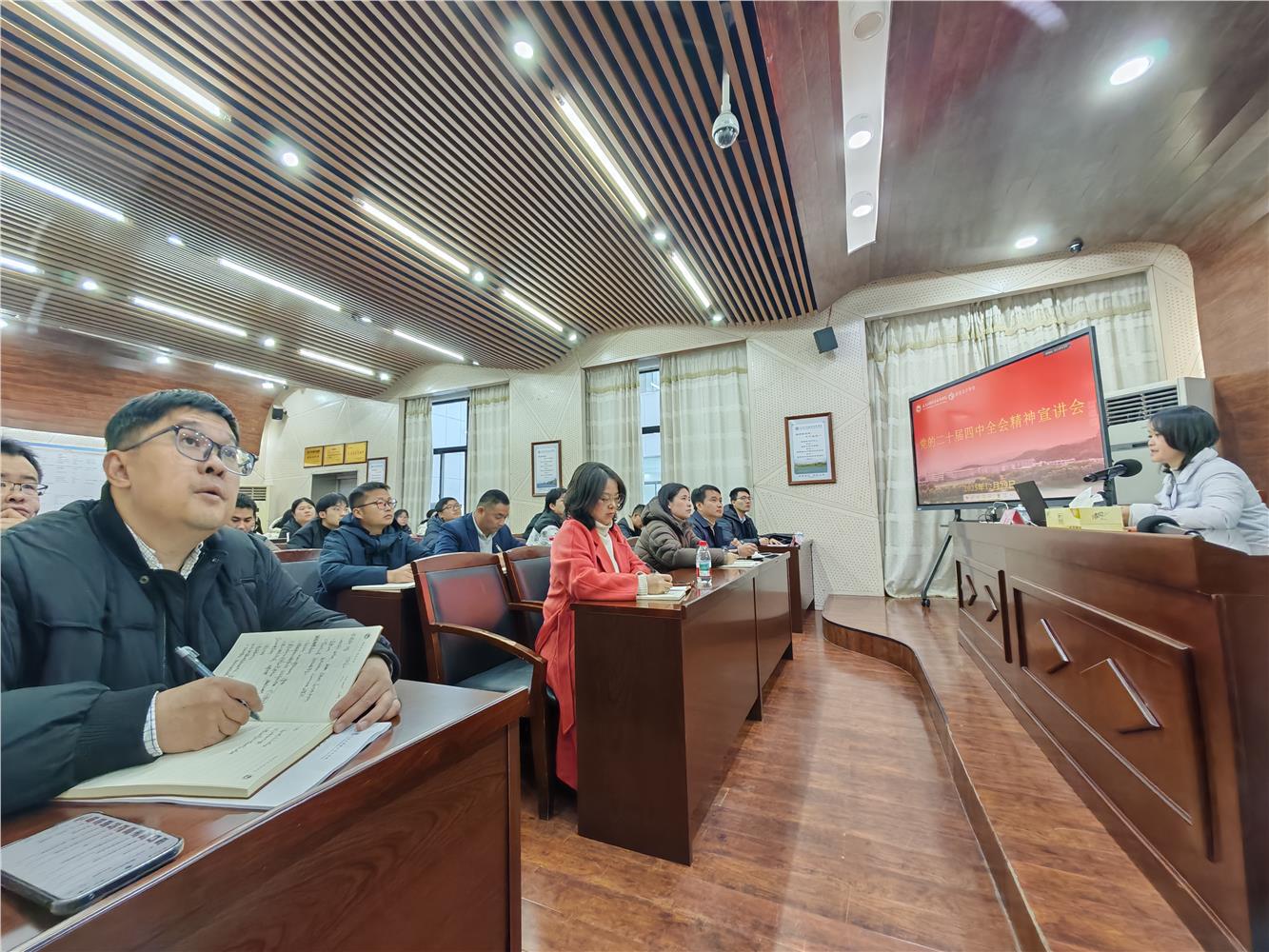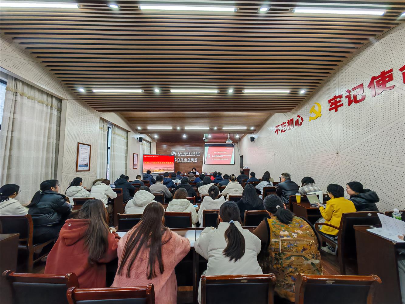 为深入学习宣传贯彻党的二十届四中全会精神,12月29日,创意设计学院在创意园报告厅举行学习贯彻党的二十届四中全会精神专题宣讲报告会。校党委委员、组织部部长、统战部部长、离退休工作处处长彭春燕作专题宣讲报告。创意设计学院党委成员、党员教师代表、党员学生代表等80余人参加报告会。