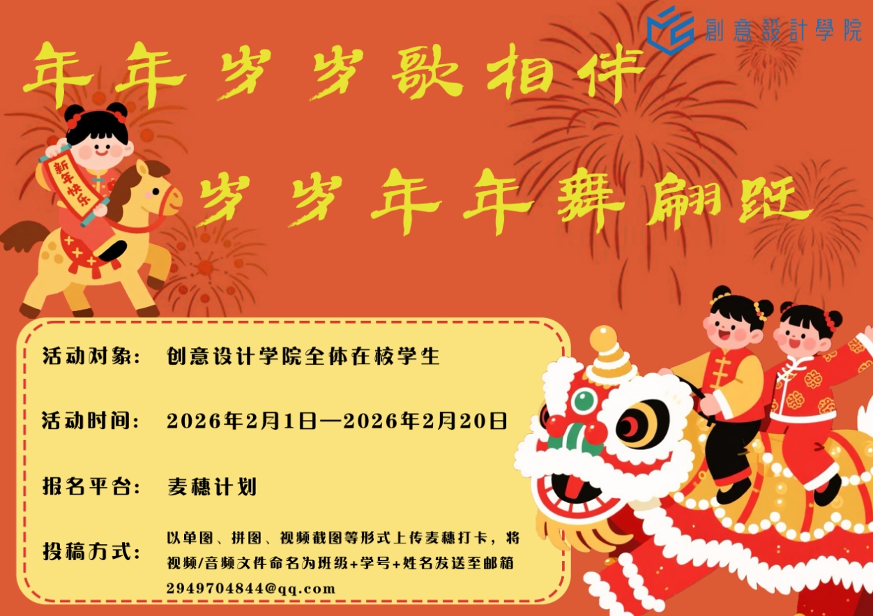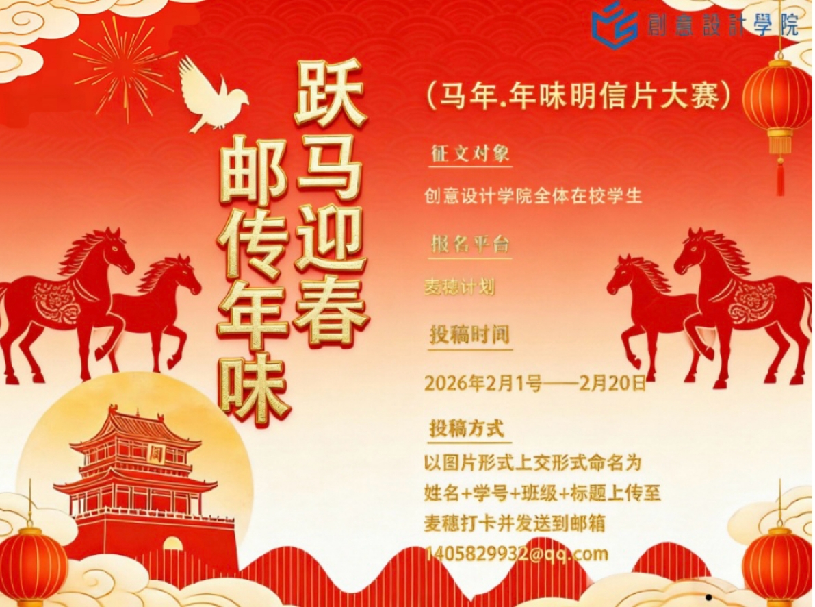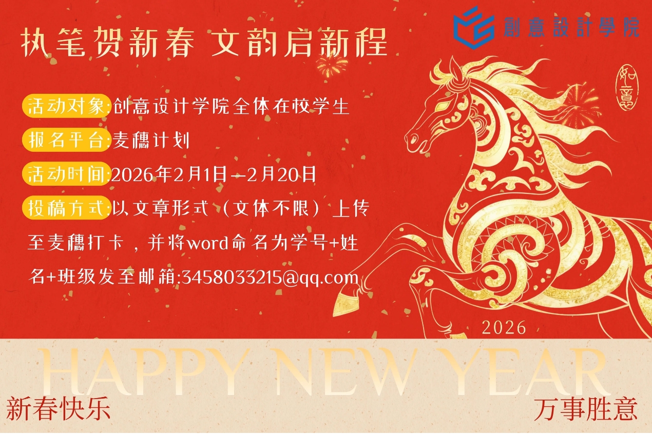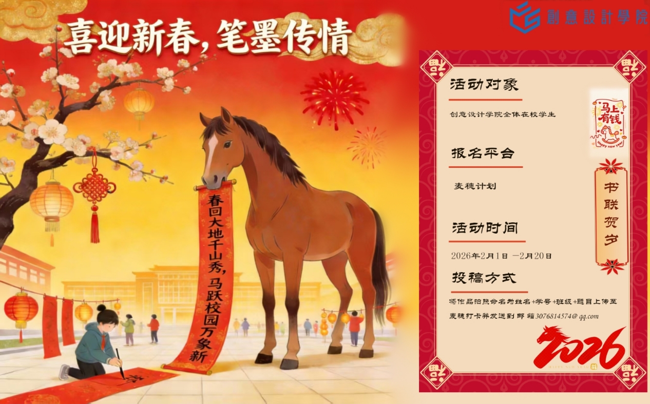 马年吉祥,骏马呈祥。我们迎来了充满希望的寒假时光,也即将踏入喜气祥和的春节。为传承和弘扬中华优秀传统文化,创意设计学院特别策划“金马奔腾,‘午’限风采”系列文化活动,让丰富多彩的年俗与创意交织,点亮同学们的假期生活,让青春在传统与创新的碰撞中绽放独特光彩!