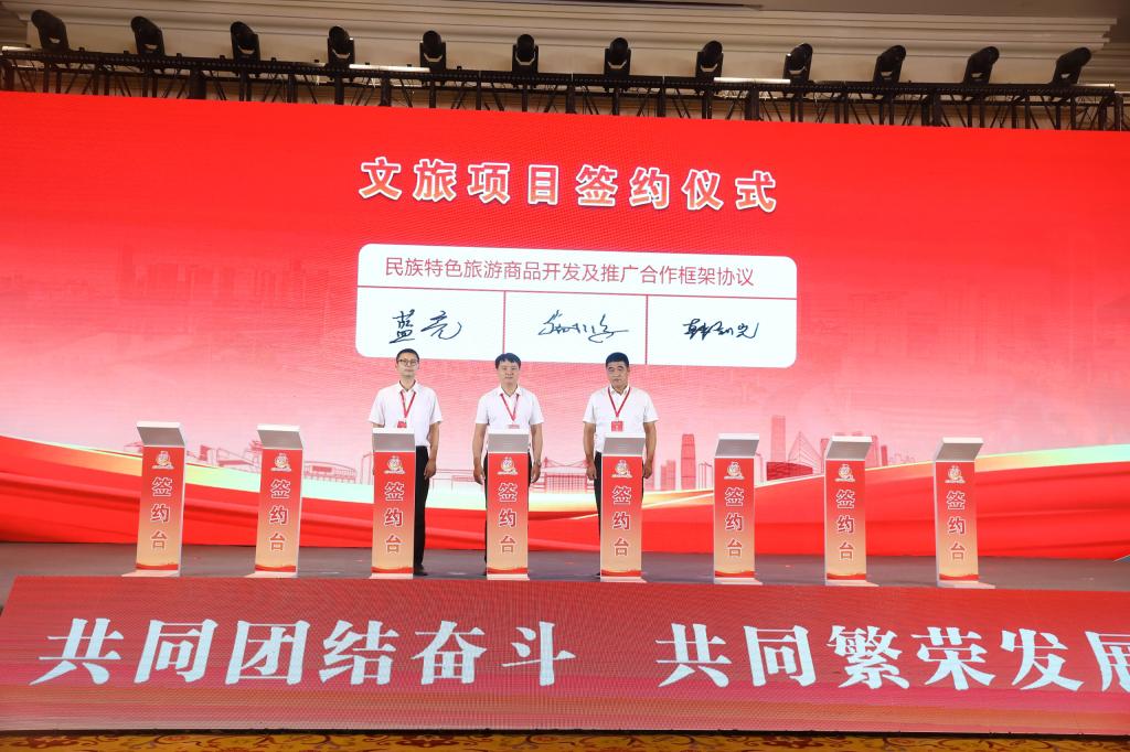 活动以《民族歌舞快闪串烧》开场,在文旅合作签约环节中,创意设计学院与兰溪市水亭畲族乡、武义县柳城畲族镇签订民族特色旅游商品开发及推广合作框架协议。