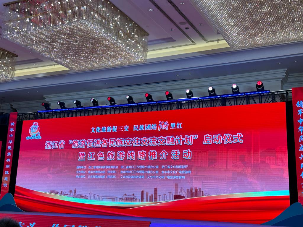 8月17日下午,浙江省“旅游促进各民族交往交流交融计划”启动仪式暨红色旅游线路推介活动在义乌市幸福湖国际会议中心召开,省委统战部副部长鲍秀英、金华市委常委、统战部部长王志强、义乌市委常委、统战部部长贾以鸣等领导出席,创意设计学院党委负责人、创意园相关负责人受邀参加本次活动。