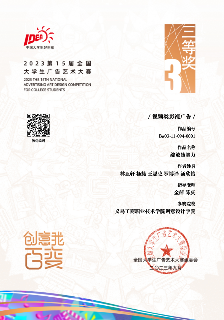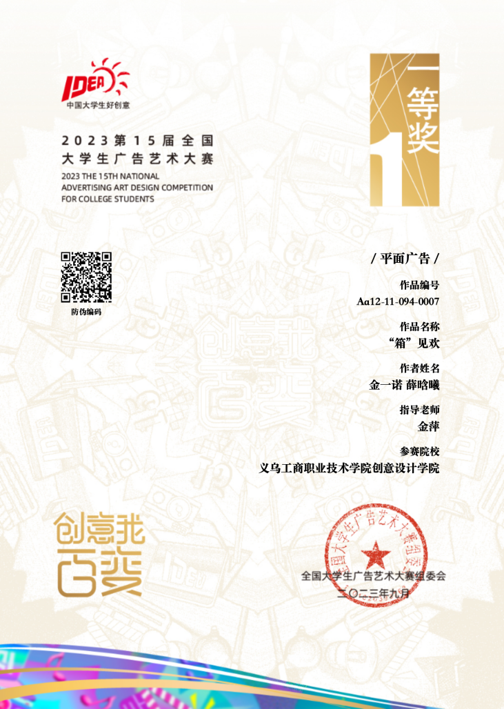 近日,2023年第十五届“全国大学生广告艺术大赛”成绩正式揭晓,创意设计学院数字媒体艺术设计专业学子在学院教师的指导下,斩获一等奖1项,三等奖1项。其中,学生金一诺,薛晗曦创作的《“箱”见欢》(指导老师:金萍)荣获平面广告类一等奖;林亚轩、杨捷、王思吏、罗博译、汤欣怡创作的《绽放她的魅力》(指导老师:金萍、陈庆)荣获视频类三等奖。