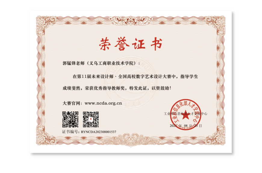 学生陈钰、朱凌烨、顾傲宇的作品《古法传承——试水⻰》(指导老师:郭锰锋)获全国一等奖。学生杨捷、王思吏、穆小⻰ 、田晨阳、朱凌志、陈宇航的作品《创⻘年-勇敢追逐中国梦的穆小⻰》(指导老师:金萍、王甜甜)获全国二等奖。学生应萱、姚彤宜的作品《不怕没钱赚,就怕你不来!》(指导老师刘艳⻜、吴义祥)获全国三等奖。同时郭锰锋老师获国赛优秀指导教师奖。全国总决赛二等奖及以上作品将参加由联合国教科文组织主办的未来设计师·国际创新设计大赛IIDA国际赛。