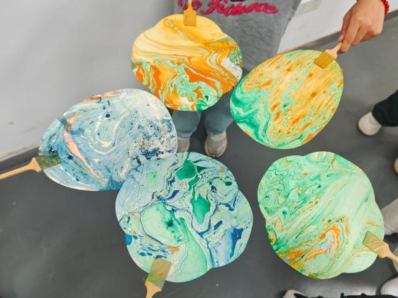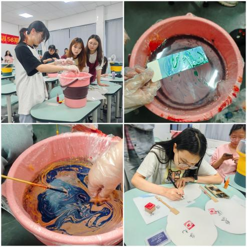 接着,学员们亲自动手体验了漆扇的制作过程。从挑选合适的扇面、调配漆料,到运用点、甩、弹、划等技法在水面上绘制图案,再到将扇面浸入水中让漆料自然附着,每一个步骤都充满了挑战和乐趣。学员们在创作过程中充分发挥想象力和创造力,绘制出了一幅幅独具特色的漆扇作品。最后,大家还在各自的作品上写下心里话,抒发感恩之情。