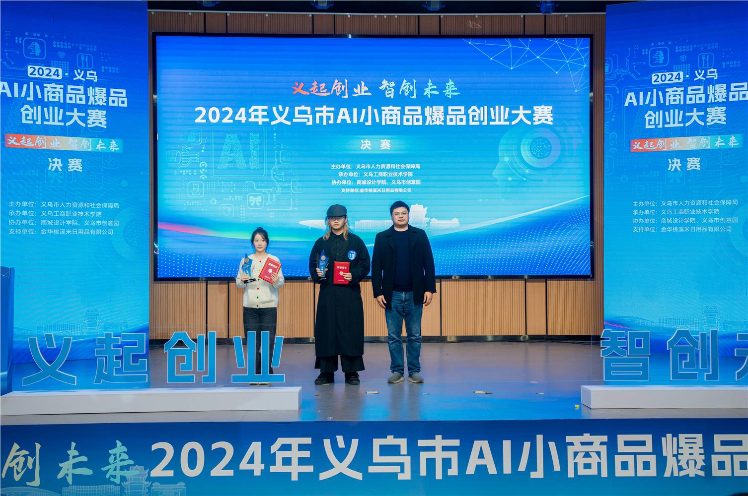2024年12月4日,义乌市“义起创业 智创未来”AI小商品爆品创业大赛决赛在义乌工商职业技术学院大学生活动中心举办。义乌市人力资源和社会保障局副局长王亮、义乌市就业和人才管理服务中心副主任骆旭伟、义乌工商职业技术学院创意设计学院相关负责人,浙江师范大学设计与创意学院产品设计专业主任、金华市数字经济学会副秘书长吴维伟,义乌文化用品行业协会副会长、KUKI可奇家造型笔创始人黄平,义乌桃溪米新材料科技有限公司创始人、义乌市品牌促进会副会长朱庆元等学术界和产业界的评委嘉宾出席了本次活动。