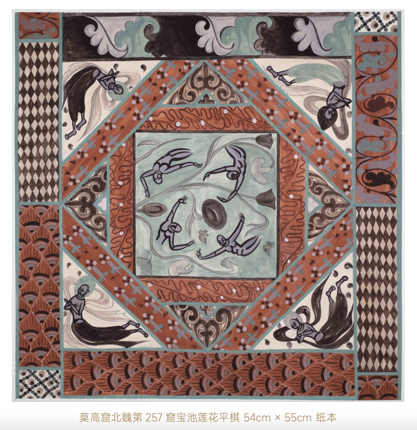 该作品尺寸为 54cm × 55cm,采用纸本材质,以敦煌莫高窟北魏时期第257窟中的宝池莲花平棋为复原临摹对象。方荷静老师凭借其深厚的绘画功底和对敦煌艺术的深刻理解,巧妙地将传统图案与现代审美相结合,使作品呈现出独特的艺术魅力。画中宝池莲花形态各异,色彩丰富而不失典雅,线条流畅而富有节奏感,仿佛将观者带入了那个充满神秘色彩与宗教气息的历史时期。