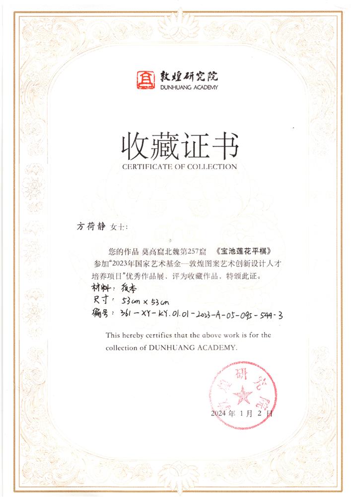 方荷静老师作为我校艺术设计领域的教师,一直致力于传统文化艺术的传承与创新。此前,通过参与“国家艺术基金——敦煌图案艺术创新设计人才培训”项目,方老师与来自全国各地的优秀艺术人才共同学习交流,为今后的创作与教学工作积累了宝贵经验。此次作品的被国际级博物馆收藏,不仅展示了其个人的艺术才华,更是对我校艺术教育成果的一次有力证明。