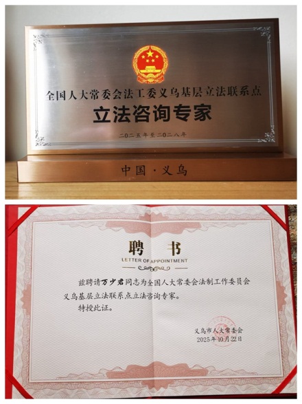 近日,义乌市人大常委会正式公布了新一届立法咨询专家名单。经过严格推荐和遴选程序,我院教师万少君凭借丰富的专业实践能力、卓越的学术声誉,以及多次参与地方政府公共事务论证和咨询工作并获得广泛好评的实绩,成功入选全国人大常委会法工委义乌基层立法联系点立法咨询专家库。
