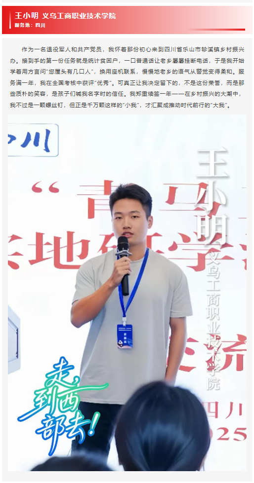近日,浙江高校网络思想政治工作中心微信公众号发布了“出发,到西部去!”主题征稿,内容发布后,我院毕业生王小明的大学生志愿服务西部计划先进事迹成功入选,其扎根基层、建功西部的青春故事被收录其中,成为青年学子践行志愿精神、勇担时代使命的生动范例。