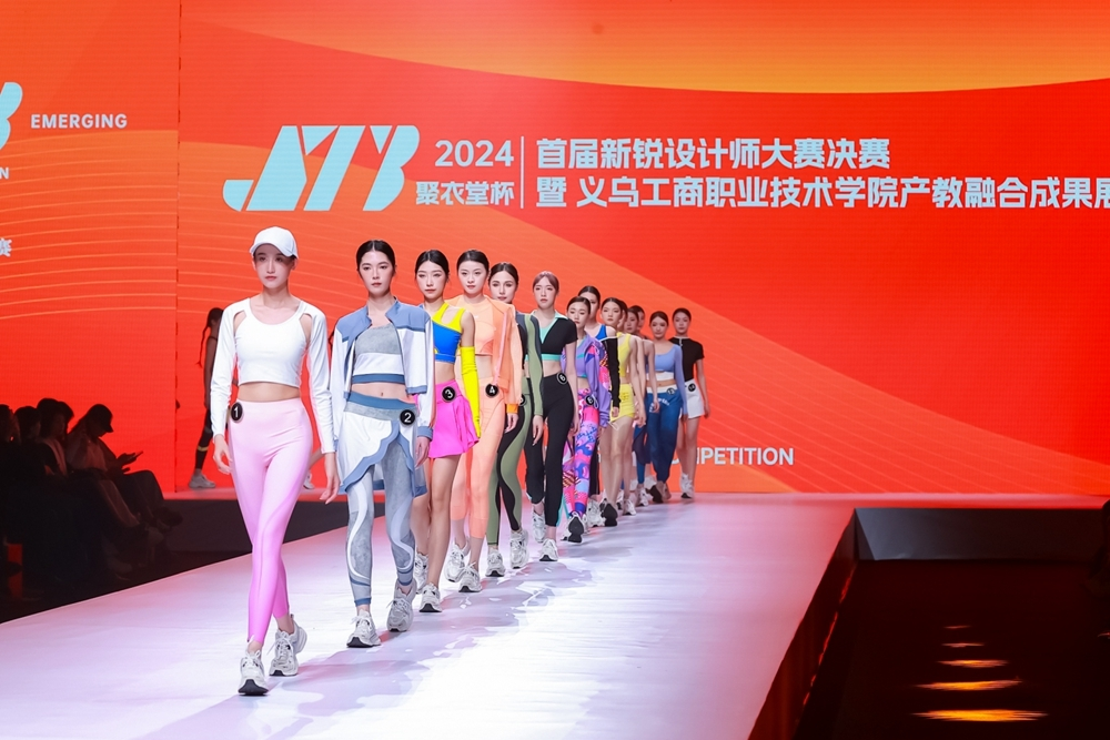 色彩鲜亮明快的糖果运动服、采用“黑科技”实用新型面料的专业瑜伽服、融合传统文化元素的新国潮产品、跨界互动的联名创意……4月12日,在首届“聚衣堂杯”轻运动瑜伽服新锐设计师大赛决赛暨义乌工商职业技术学院产教融合成果展的“无界”秀场T台上,户外运动、多巴胺、功能性、奶茶联名等四个主题的百余套设计作品轮番登台,在专业模特的演绎下,让现场的商业“燃点”和人气“燃点”爆棚。
