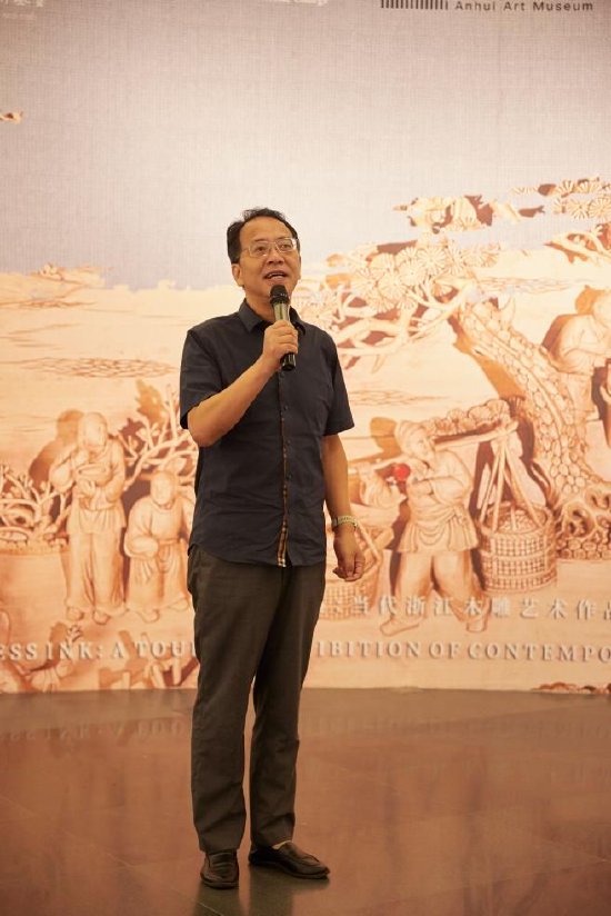 安徽站展览开幕式于上午10时在安徽省美术馆10号厅举行。安徽省美术馆馆长王岭,项目策展人、清华大学王建中教授,安徽省工艺美术学会会长郭宝安,中国工艺美术大师、安徽省工艺美术行业协会理事长曹永盛,浙江省工艺美术大师姚江涛以及义乌工商职业技术学院创意设计学院相关负责人等出席开幕式和座谈会。安徽省美术馆馆长王岭宣布“无墨之墨:当代浙江木雕艺术作品巡展”安徽站开幕。